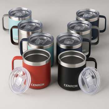 Taza de café de acero inoxidable de doble pared 12oz con asa, tapa a prueba de salpicaduras; recubierto de polvo, logotipo personalizado para B2B